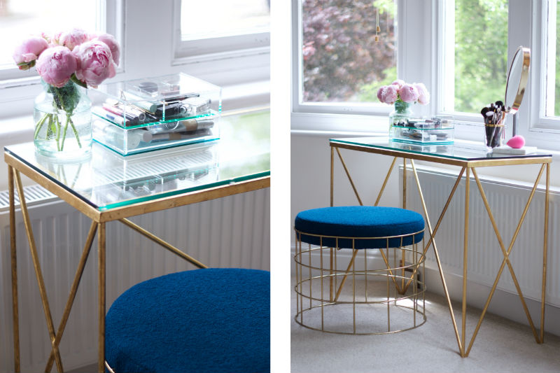 I’d been looking for a console and stool for yonks, but I didn’t want anything made from wood as there is already a lot of wood going on in the bedroom (nope, nope, nope – get your minds out of the gutter people!) and metal/glass combos are hard to come by, so when I spotted this number on Oliver Bonas I don’t think I’ve ever got out my tape measure and card details so quickly. This Midnight Hudson Pouffe was just the right height and added a bit of colour to things, so I snapped that up too. Finally somewhere to sit! I felt well glam the first time I used it and being right in front of the window has meant that people no longer need to wear sunglasses when looking at my face due to excessive highlighter application.