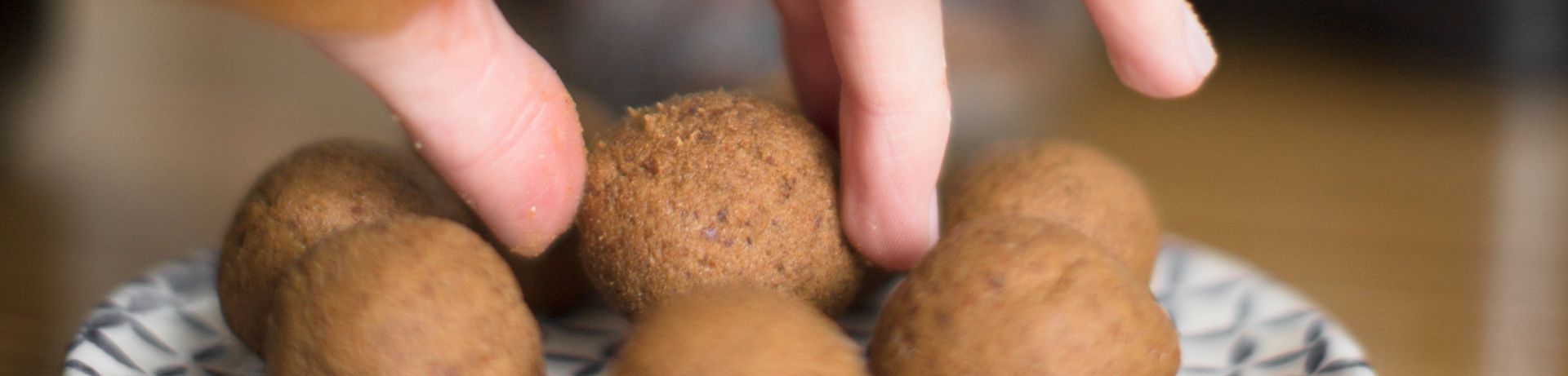 The best bit about these ball recipes is that as long as you’ve got a food processor then you’re good to go. I throw all the ingredients in at the same time and then just press go. It might need a little bit of scrapping the mixture down the sides midway, but after a minute or so you should end up with one giant ball of mixture. If it seems too wet then just add a little more ground almonds or if it’s too dry add another tablespoon of water. You want the mixture to be sticky enough to hold together, but not too sticky to mould. I take my tablespoon scoop and spoon out the mixture, rolling a tablespoons-full into a ball and placing on a plate or into a tupperware box. When you’ve rolled them all out, add a little extra salt if needed, then place in the freezer for about an hour to harden up, before keeping them in the fridge. Lock them down in an airtight container and they should last a week or two.